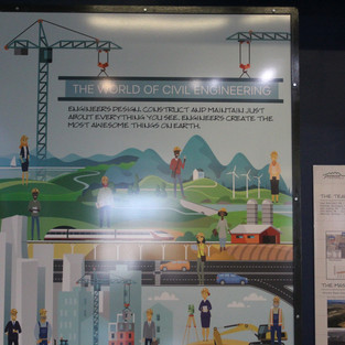 The exhibit was built on site in the basement workshop by the exhibits manager, Matt Jerry; The team already had many of the pieces, such as the shake table. The exhibit is geared more towards elementary and preschool kids, but there are many facts displayed about the different jobs around the exhibit and high schoolers can volunteer to help out at the museum. Pieces of the exhibit include: “Quake Shake Table”, “Lego table”, “The Whole of Civil Engineering”, “The Seven Wonders of the Modern World”, and vintage Morrison Maierle equipment including facts about the pieces of technology, “Typhoon Table”, and “Did You Know?” facts with each piece.